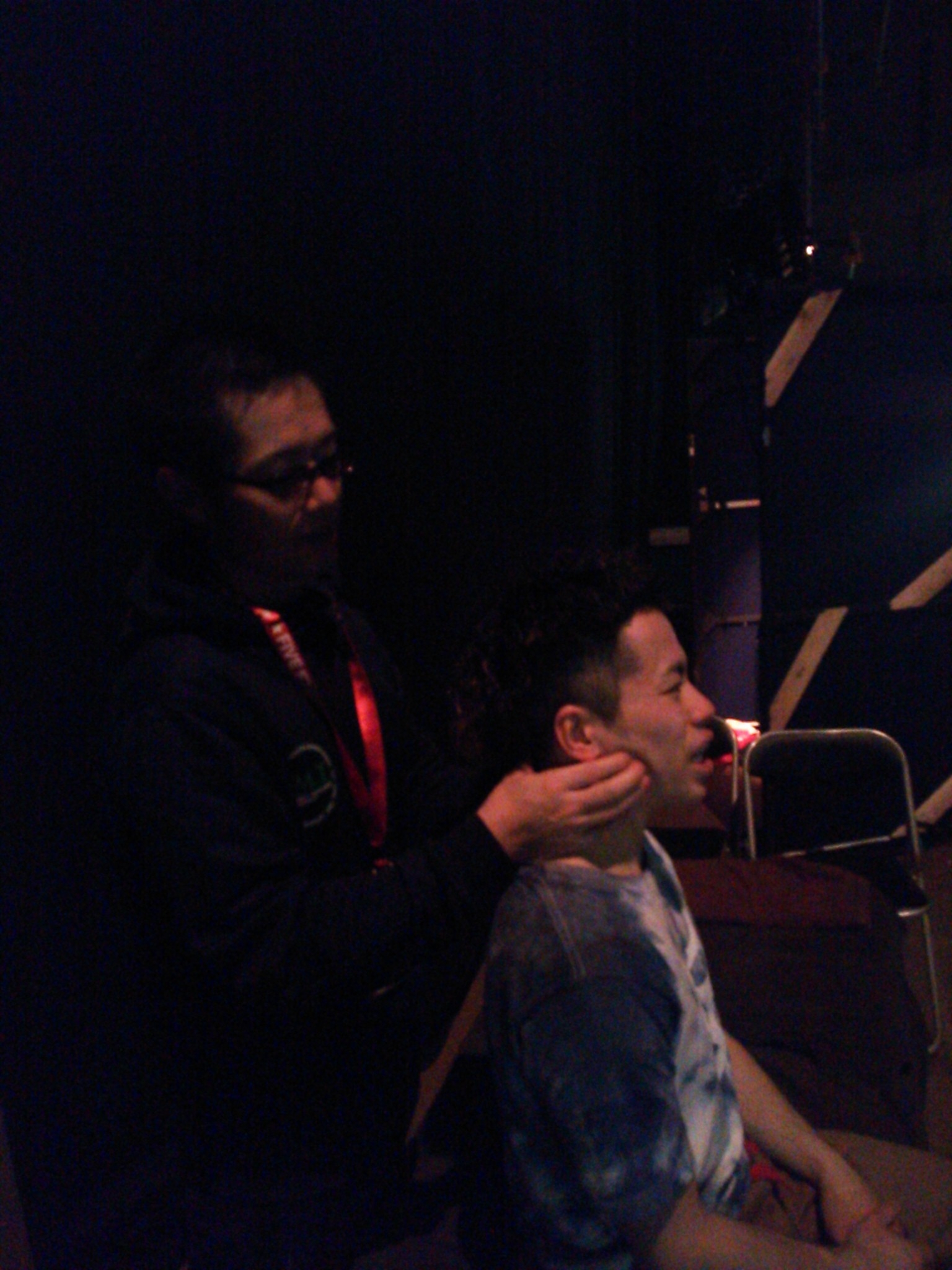 舞台袖にベットをおいてメンバーの方々へのコンディショニング。