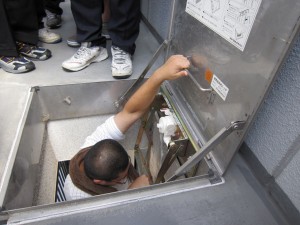 次に淵岡教員による避難はしごを使っての実演後、学生代表に実際に降りてもらいました。